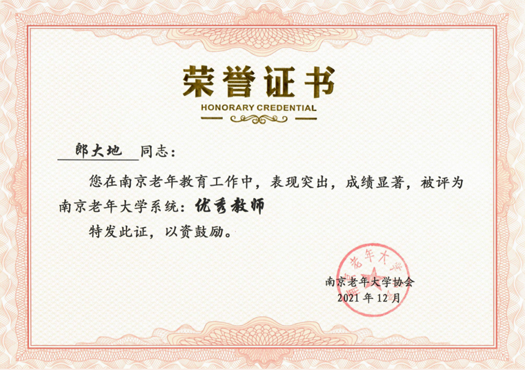 在长期的教学过程中,郎大地老师始终紧扣老年学员的学习特点与身心需求,精心遴选教材、潜心备课,引领学员们从思想内涵、审美意蕴与创作手法等多维度,深入品味文学经典,感悟中华传统文化的深厚魅力。其课堂深受学员喜爱,教学品质有口皆碑,曾于2021年荣获“南京老年大学系统优秀教师”。